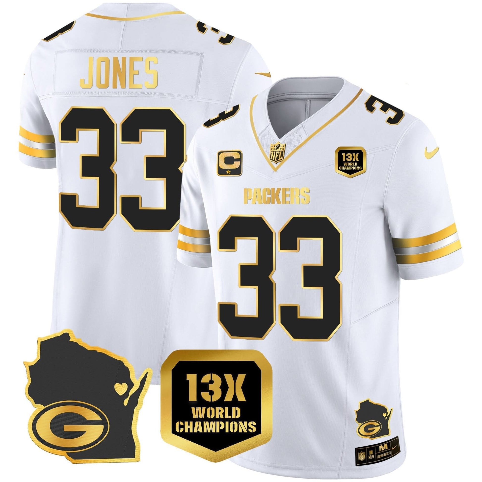 Packers 13 Time World Champions & Home Patch Gold Vapor Jersey V2 - All Stitched